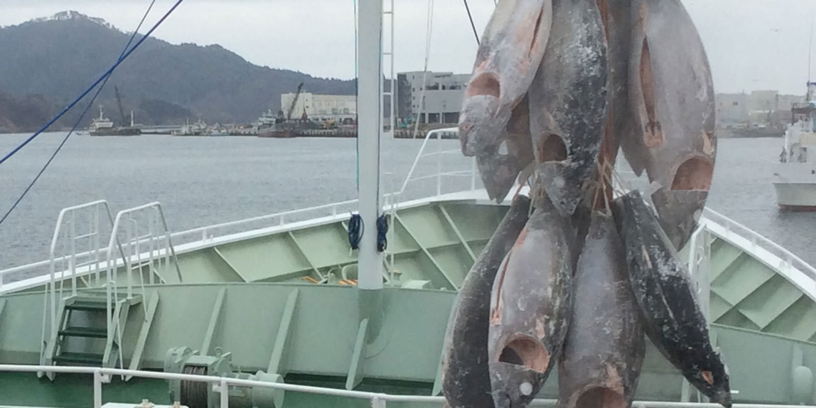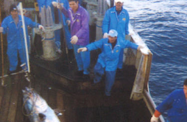 川印 村田漁業所有の遠洋鮪延縄船6隻は、太大西洋を主な漁場として、インド洋、太平洋へと漁場を広げ、今日もマグロを追い続けています。大功丸は、時には一年以上にも及ぶ航海を終えて、世界の海から新鮮な極上マグロを積んで、気仙沼港に帰ってきます。